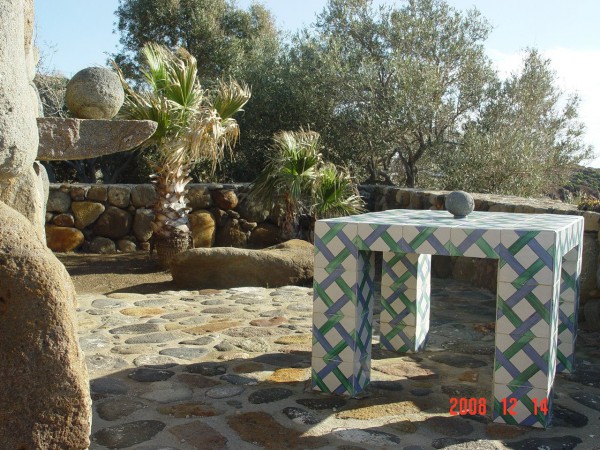 terrazza per pranzo e soggiorno all’aperto con bissuoli (sedili) in pietra originale e copertura di stuoia di canne;